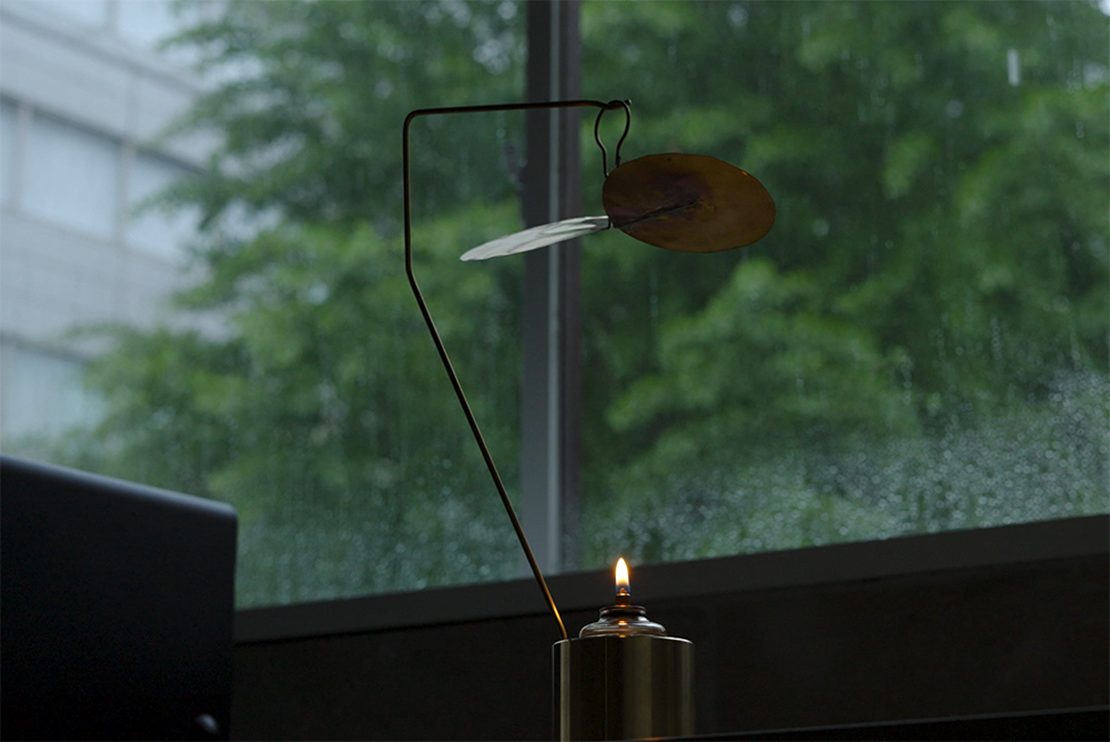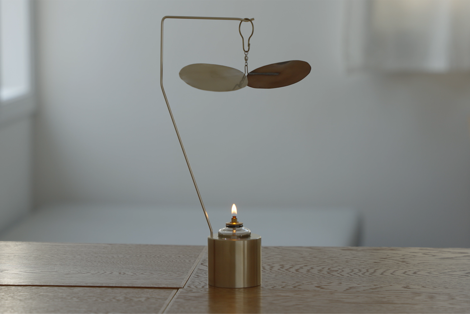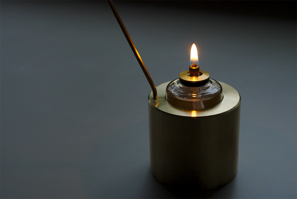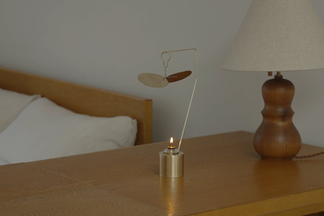 Turning Lampは炎の熱で真鍮の羽根を旋回させるオイルランプ。ゆっくりと旋回する羽根は、炎のゆらめきを反射させて光ながら動き続けます。光と影が織りなす空間を眺めるだけで気持ちがほぐれ、じんわりと心が温まることでしょう。